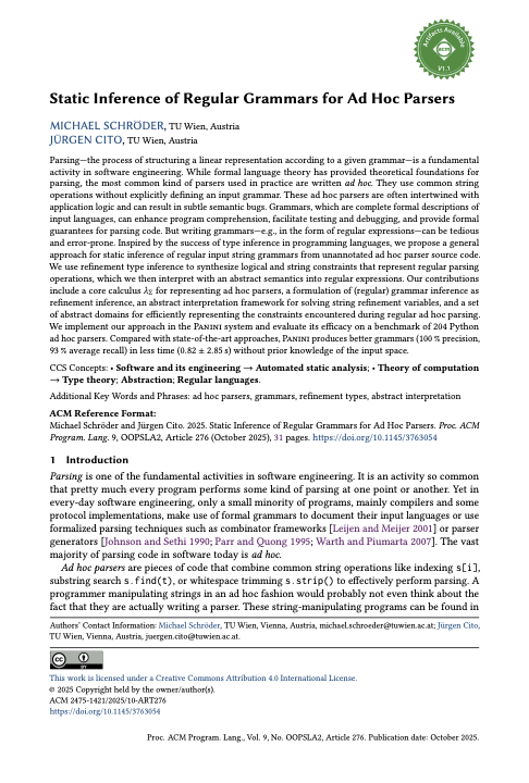 In my ongoing PhD research, I aim to statically infer input string grammars from unannotated ad hoc parser source code. To this end, I am developing Panini, a system for automatic end-to-end grammar inference using program slicing, refinement type inference, abstract interpretation, and SMT solving.
